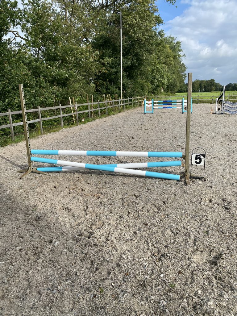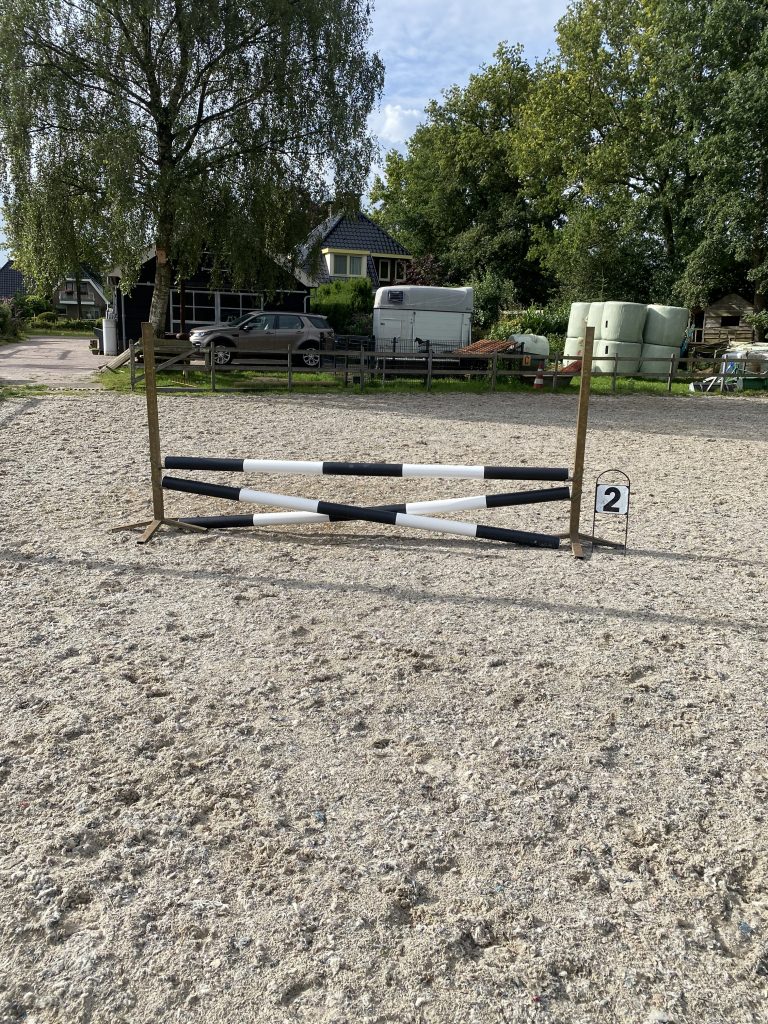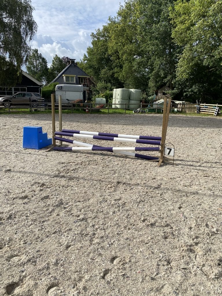 Ik heb in mijn 25 x 40 rijbak regelmatig een prachtig parcours staan of een mooi trainingslijntje. Super geschikt dus voor een mooie spring training! Bekijk hieronder de hindernissen.